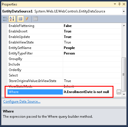 Cambie a vista Diseño y seleccione el control EntityDataSource. En la ventana Propiedades , establezca la propiedad Where en it.EnrollmentDate is not null.
