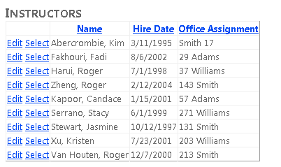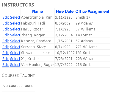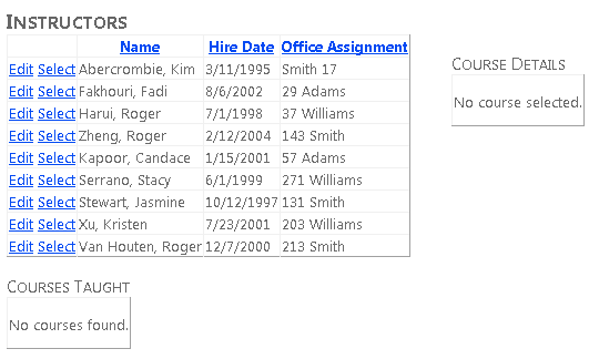 Creará la página Instructors que muestra una lista de instructores. Al seleccionar un instructor, verá una lista de los cursos que enseña ese instructor. Al seleccionar un curso, verá los detalles del curso y una lista de alumnos inscritos en el curso. Puede editar el nombre del instructor, la fecha de contratación y la asignación de oficina. La asignación de office es un conjunto de entidades independiente al que se accede a través de una propiedad de navegación.