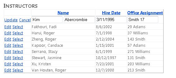 La última columna contiene la asignación de oficina del instructor, que se almacena en una propiedad de navegación de la Person entidad porque procede de una entidad asociada. Observe que el EditItemTemplate elemento especifica Eval en lugar de Bind, ya que el GridView control no puede enlazar directamente a las propiedades de navegación para actualizarlos. Actualizará la asignación de office en el código. Para ello, necesitará una referencia al TextBox control y la guardará en el TextBox evento del Init control.