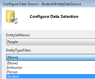 En el Diseñador de Visual Studio, puede especificar el tipo de entidad que un EntityDataSource control debe seleccionar en el cuadro desplegable EntityTypeFilter del Configure Data Source asistente, como se muestra en el ejemplo siguiente.