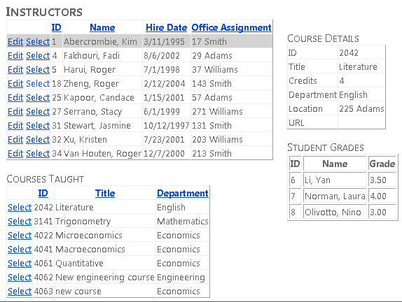 Actualice las páginas siguientes que creó en tutoriales anteriores para que usen las entidades y nuevas Student Instructor en lugar de Person las entidades y, a continuación, ejecútelos para comprobar que funcionan como lo hicieron antes: