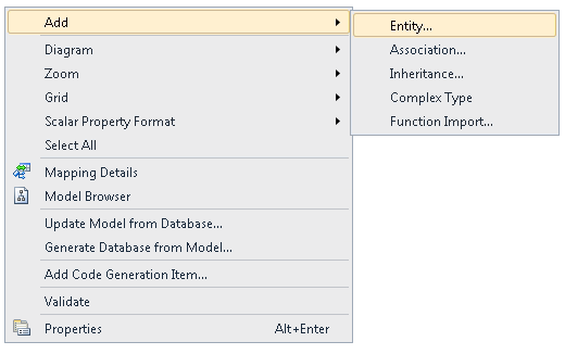 Abra el archivo SchoolModel.edmx, haga clic con el botón derecho en un área no ocupada en el diseñador, seleccione Agregary, a continuación, seleccione Entidad.