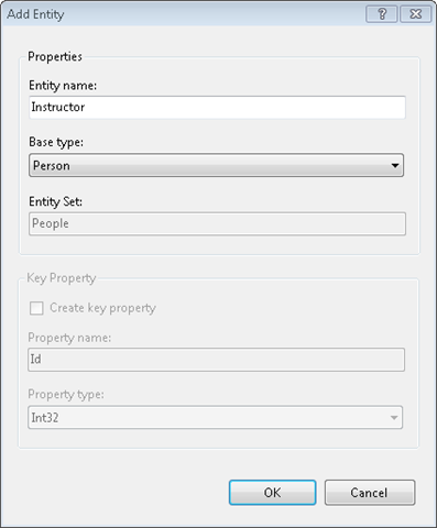 En el cuadro de diálogo Agregar entidad, asigne el nombre a la entidadInstructor y establezca su opción Tipo base enPerson.