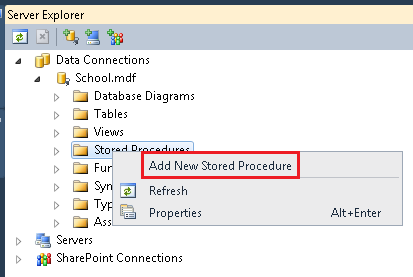 En el Explorador de servidores, expanda School.mdf, haga clic con el botón derecho en Procedimientos almacenados y seleccione Agregar nuevo procedimiento almacenado.