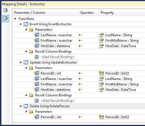 En la misma ventana Detalles de asignación, asigne la función Update al procedimiento almacenado UpdateStudent (asegúrese de especificar FirstMidName como valor de parámetro para FirstName, como hizo para el procedimiento almacenado Insert) y la función Delete al procedimiento almacenado DeletePerson.