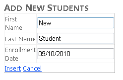 Entity Framework usa automáticamente los procedimientos almacenados para insertar, actualizar y eliminar datos después de agregarlos al modelo de datos y asignarlos a las entidades adecuadas. Ahora puede ejecutar la página StudentsAdd.aspx, y cada vez que cree un nuevo alumno, Entity Framework usará el procedimiento almacenado InsertStudent para agregar la nueva fila a la tabla Student.