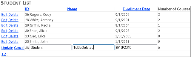 Cambie el nombre para comprobar que funciona la función de actualización y, a continuación, elimine el alumno para comprobar que funciona la función Delete.