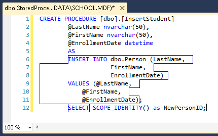Las entidades Student tienen cuatro propiedades: PersonID, LastName, FirstName y EnrollmentDate. La base de datos genera automáticamente el valor de identificador y el procedimiento almacenado acepta parámetros para los otros tres. El procedimiento almacenado devuelve el valor de la clave de registro de la nueva fila para que Entity Framework pueda realizar un seguimiento de eso en la versión de la entidad que mantiene en la memoria.