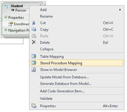 En el diseñador de modelos de datos, haga clic con el botón derecho en la entidad Student y seleccione Asignación de procedimientos almacenados.