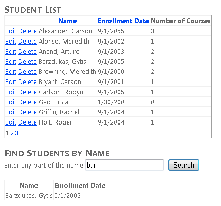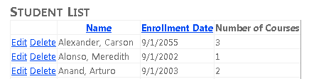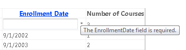 EnrollmentDatese mostrará como una fecha (sin una hora).- Ambos campos de nombre deben tener 25 caracteres o menos de longitud y se proporciona un mensaje de error personalizado.