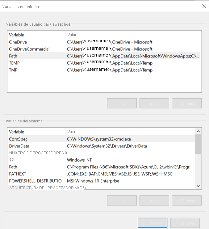 Captura de pantalla que muestra las variables de entorno predeterminadas.