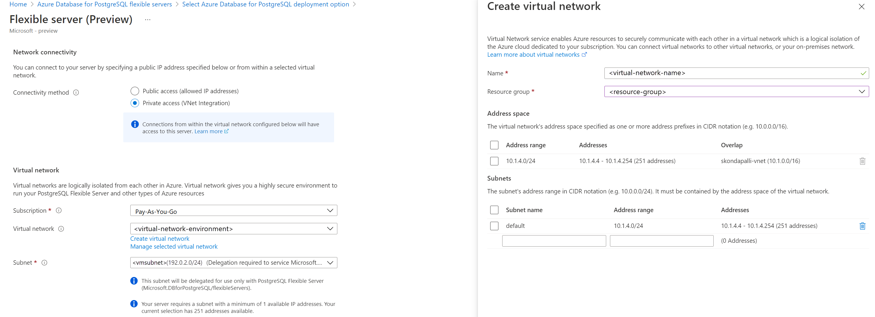 Vaya a la pestaña Redes y seleccione acceso privado. No puede cambiar el método de conectividad después de crear el servidor. Seleccione Crear una red virtual para crear una red virtual llamada vnetenvironment1. Seleccione Aceptar una vez que haya proporcionado el nombre de la red virtual y la información de subred.