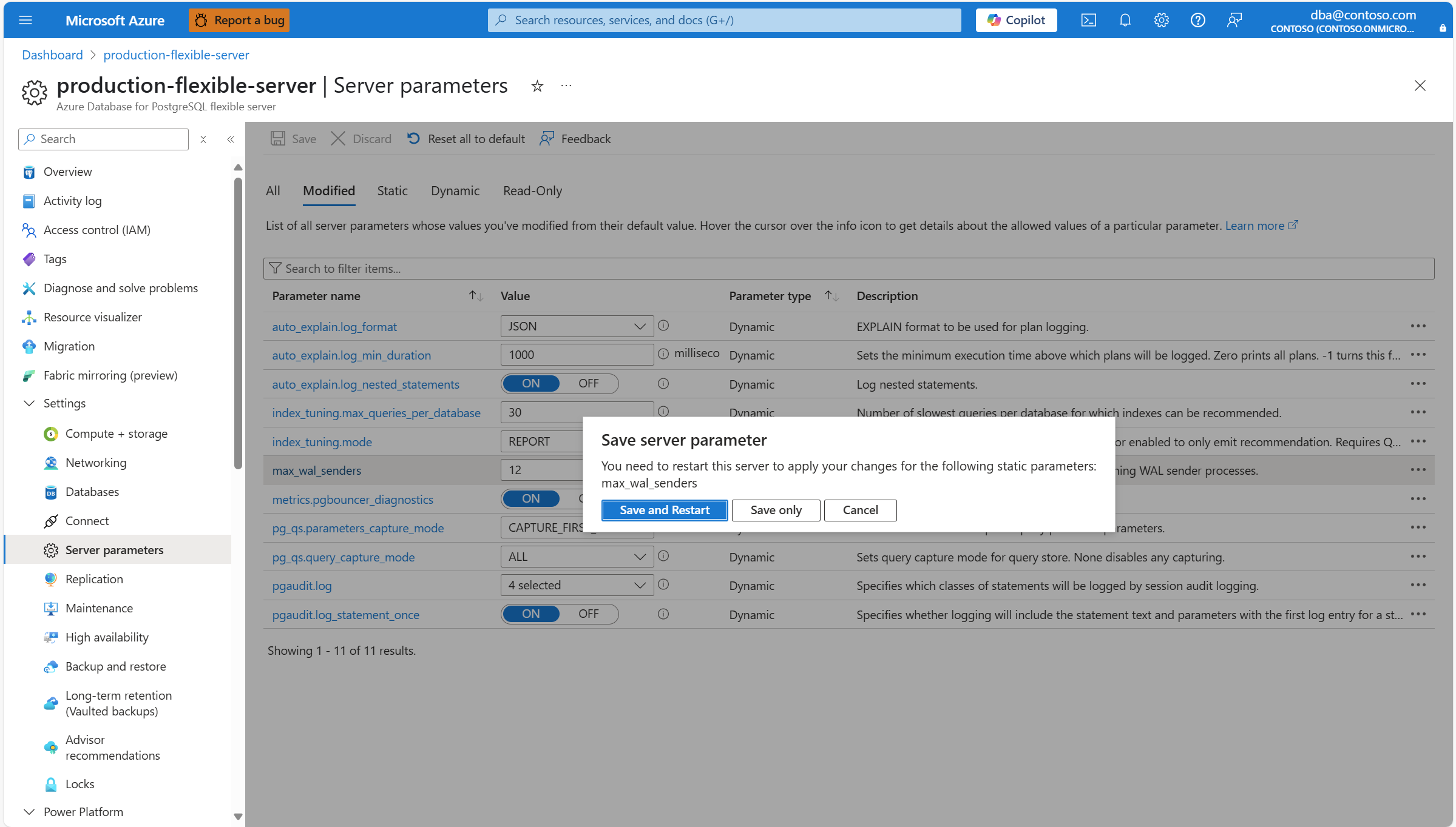 Si la columna Tipo de parámetro para el parámetro que intenta restablecer de forma predeterminada es igual a Estático, el servidor requiere un reinicio para que el cambio entre en vigor. En ese caso, aparece un cuadro de diálogo para que pueda seleccionar si desea:
