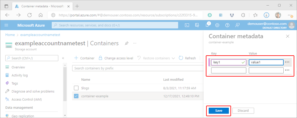 El panel Metadatos del contenedor mostrará los pares clave-valor de metadatos existentes. Los datos existentes se pueden editar seleccionando una clave o un valor existentes y sobrescribiendo los datos. Puede agregar metadatos adicionales y proporcionar datos en los campos vacíos proporcionados. Por último, seleccione Guardar para confirmar los datos.