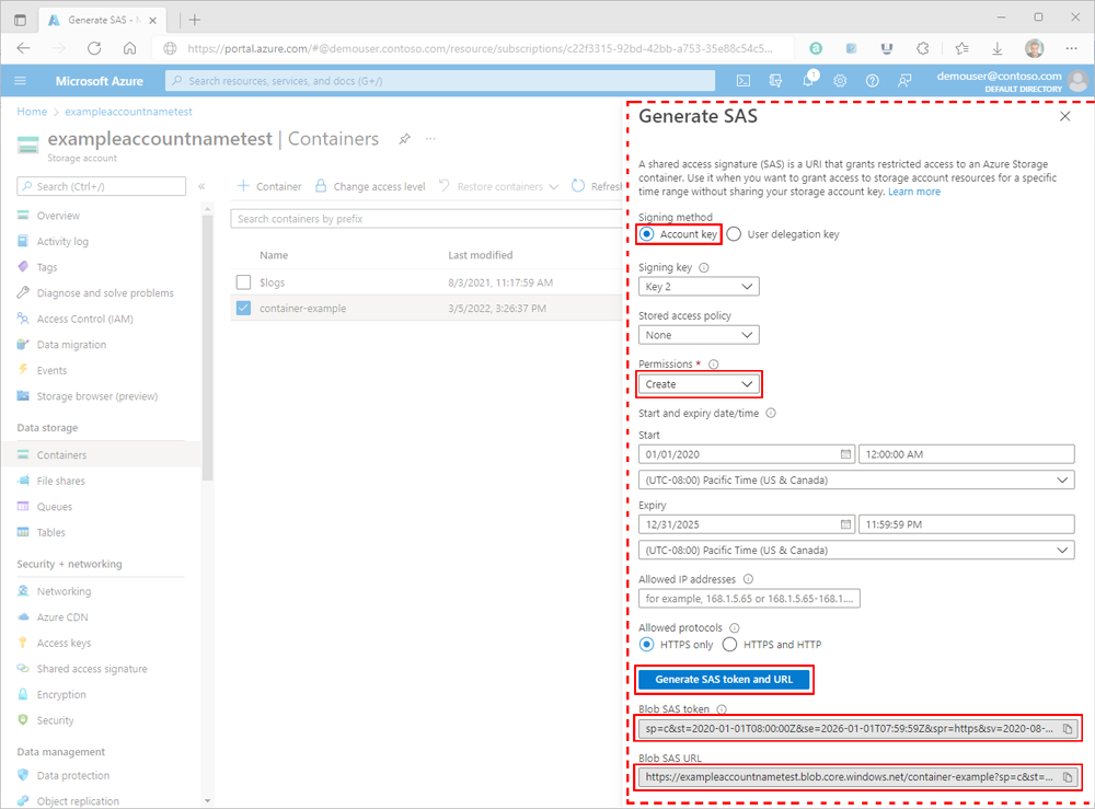 Revise la configuración para obtener exactitud y, a continuación, seleccione Generar token SAS y URL para mostrar el token SAS de blob y las cadenas de consulta URL SAS de blob.