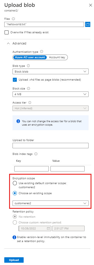 Al cargar un blob, puede especificar un ámbito de cifrado para ese blob o usar el ámbito de cifrado predeterminado para el contenedor, si se ha especificado uno.