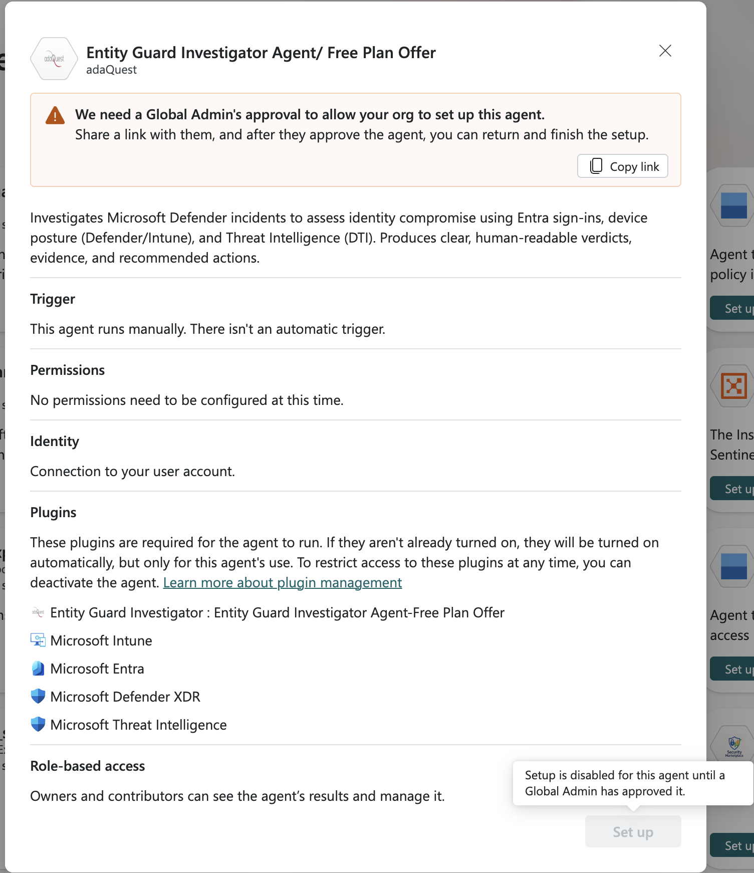 Una vez completada la aprobación, el propietario o colaborador de Security Copilot puede finalizar la configuración del agente. También tiene la opción de configurar el agente para los usuarios de su organización.