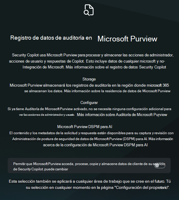 Para habilitar purview DSPM para soluciones de inteligencia artificial y UAL para Security Copilot, la funcionalidad debe habilitarse dentro de Security Copilot y configurarse dentro de las soluciones de Purview correspondientes. Hay dos opciones para habilitar las funcionalidades dentro de Security Copilot. Inicialmente, durante la primera experiencia de ejecución, un administrador de seguridad puede optar por permitir que Microsoft Purview acceda, procese, copie y almacene acciones de administrador, acciones de usuario y respuestas de Copilot. Para obtener más información sobre cómo empezar a trabajar con Security Copilot consulte Introducción a Security Copilot.