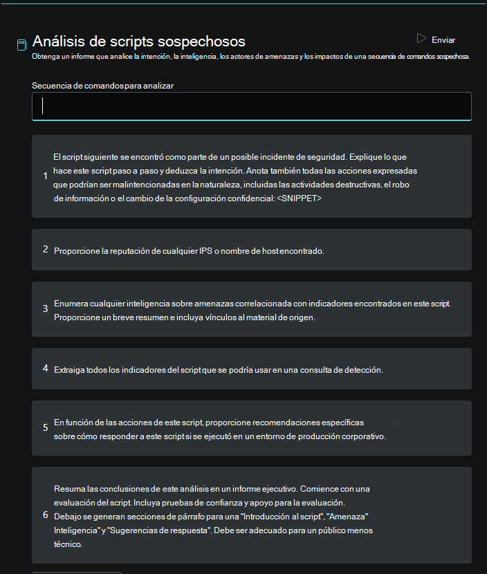 Security Copilot viene con promptbooks precompilados, una serie de mensajes que se han reunido para realizar tareas específicas relacionadas con la seguridad. Pueden funcionar de forma similar a los cuadernos de estrategias de seguridad(flujos de trabajo listos para usar que pueden servir como plantillas para automatizar pasos repetitivos), por ejemplo, en relación con la respuesta a incidentes o las investigaciones. Cada promptbook precompilado requiere una entrada específica (por ejemplo, un fragmento de código o un nombre de actor de amenaza).