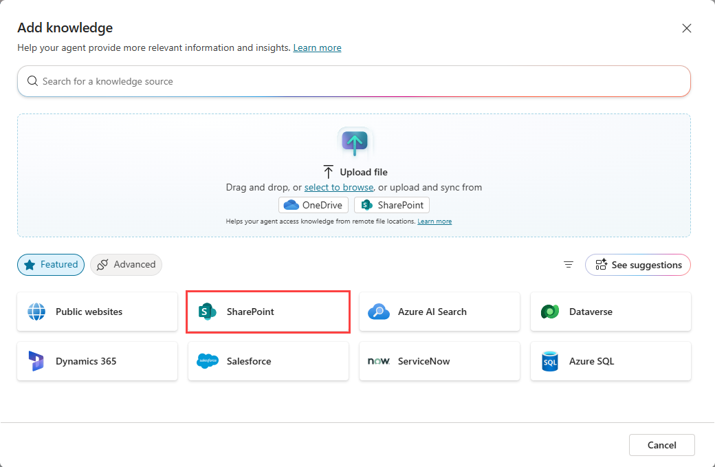 En el cuadro de diálogo Agregar conocimiento, hay dos opciones de SharePoint. La opción de SharePoint en la sección de carga de archivos se usa para cargar archivos o carpetas individuales de SharePoint y habilita las funcionalidades de sincronización de archivos. En este artículo se trata la opción de SharePoint que proporciona la compatibilidad completa de SharePoint en Copilot Studio.