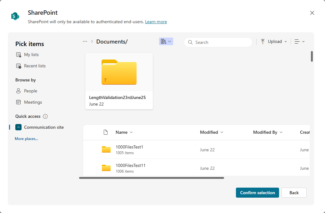 Para obtener una lista de los límites y la funcionalidad de SharePoint admitida, consulte Límites de SharePoint de aplicaciones web de Copilot Studio.