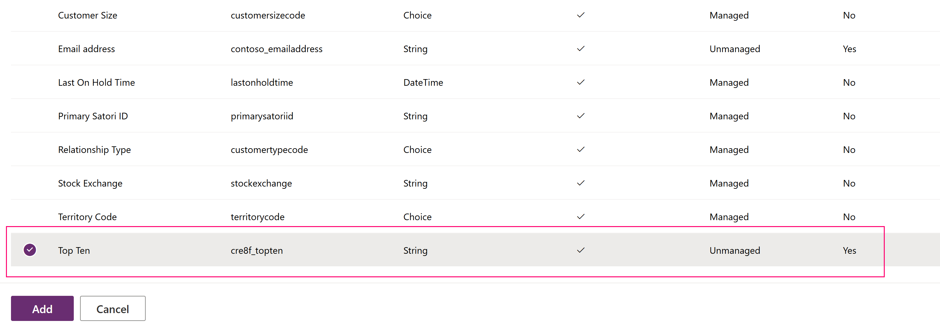 Si seleccionó Editar objetos, se abre un panel de lista de objetos. Aquí puede seleccionar los objetos específicos que desea incluir en la solución. En nuestro ejemplo, seleccionó la tabla Cuenta anteriormente, por lo que ahora selecciona la columna Top Ten , ya que es el único componente nuevo o editado de la tabla y, a continuación, seleccione Agregar.