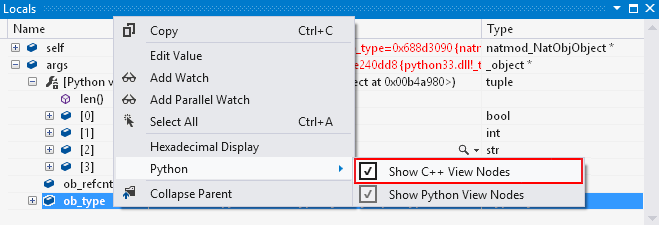 To enable the feature, right-click in the Locals window and set the Python > Show C++ View Nodes menu option.