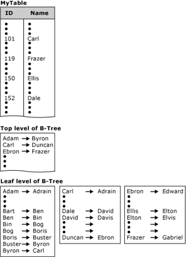 La documentación utiliza el término árbol B generalmente en referencia a los índices. En los índices de almacén de filas, el Motor de base de datos implementa un árbol B+. Esto no se aplica a los índices de almacén de columnas ni a los índices de tablas optimizadas para memoria. Para obtener más información, consulte la guía de diseño y arquitectura de índices de SQL Server y Azure SQL.