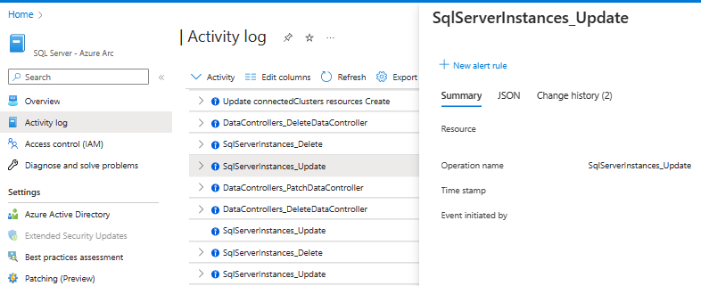 Los registros de actividad de SQL Server habilitado mediante Azure Arc proporcionan información detallada sobre los eventos relacionados con SQL Server habilitado mediante Azure Arc y la visualización de los recursos de inventario habilitado mediante Azure Arc. Los registros de actividad contienen eventos correspondientes a la creación y modificación de recursos. Estos eventos incluyen actualizaciones de instancias de SQL Server (SqlServerInstance_Update), actualizaciones de base de datos de SQL Server (SqlServerDatabases_Update) y escritura de etiquetas en los recursos.