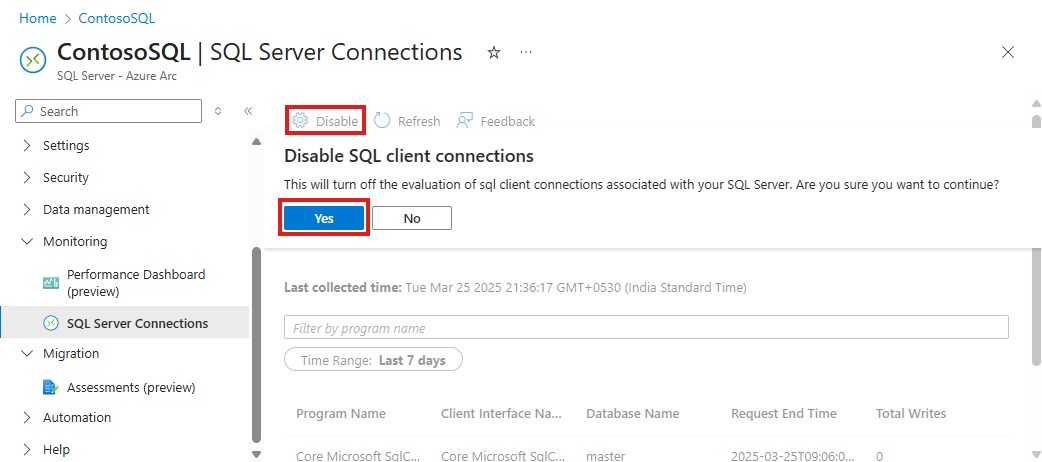 Captura de pantalla de la opción deshabilitar en la vista Conexiones de cliente SQL para SQL Server habilitada por Azure Arc.