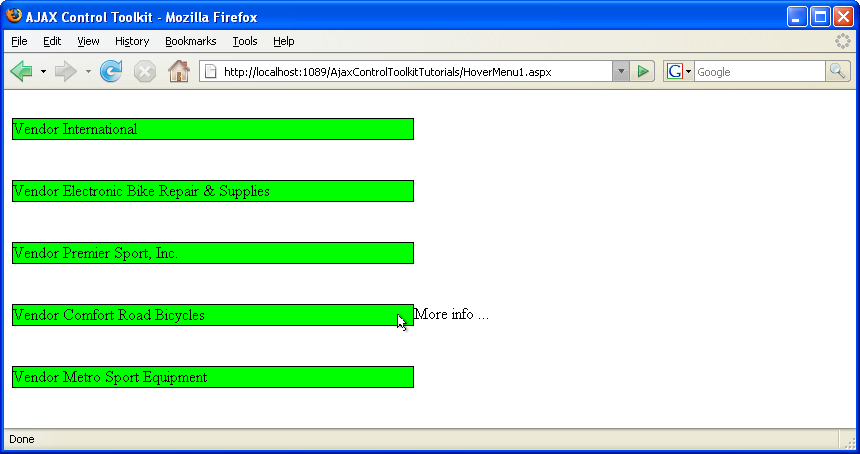 O HoverMenu controle no Kit de Ferramentas de Controle AJAX fornece um efeito pop-up simples: quando o ponteiro do mouse passa o mouse sobre um elemento, um pop-up aparece em uma posição especificada. Também é possível usar esse controle dentro de um repetidor.