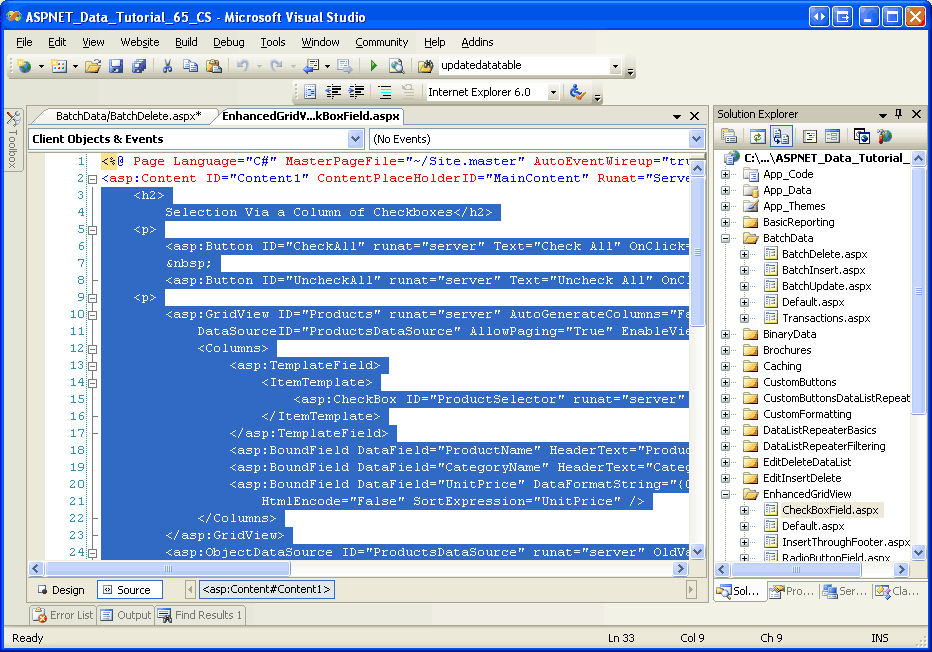 Como já criamos a interface de exclusão em lote para caixas de seleção no tutorial Adicionando uma coluna GridView de caixas de seleção, podemos simplesmente copiá-la em BatchDelete.aspx vez de criá-la do zero. Comece abrindo a BatchDelete.aspx página na BatchData pasta e na CheckBoxField.aspx página na EnhancedGridView pasta. Na página CheckBoxField.aspx, vá para a visão de origem e copie o código entre as <asp:Content> tags, como mostrado na Figura 2.