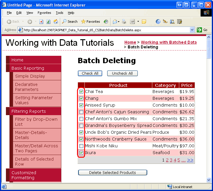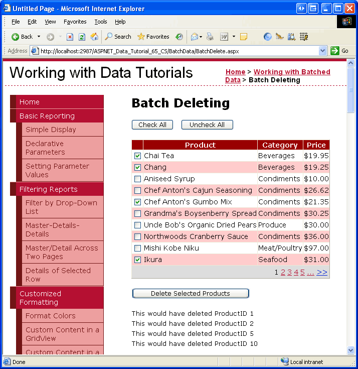 Depois de copiar a marcação declarativa e o código-fonte, dedique um momento para testá-lo BatchDelete.aspx ao visualizá-lo em um navegador. Você deve ver um GridView listando os dez primeiros produtos, com cada linha mostrando o nome do produto, a categoria e o preço, juntamente com uma caixa de seleção. Deve haver três botões: Verificar Tudo, Desmarcar Tudo e Excluir Produtos Selecionados. Clicar no botão Verificar Tudo seleciona todas as caixas de seleção, enquanto Desmarcar Tudo limpa todas as caixas de seleção. Clicar em Excluir Produtos Selecionados exibe uma mensagem que lista os ProductID valores dos produtos selecionados, mas não exclui os produtos.