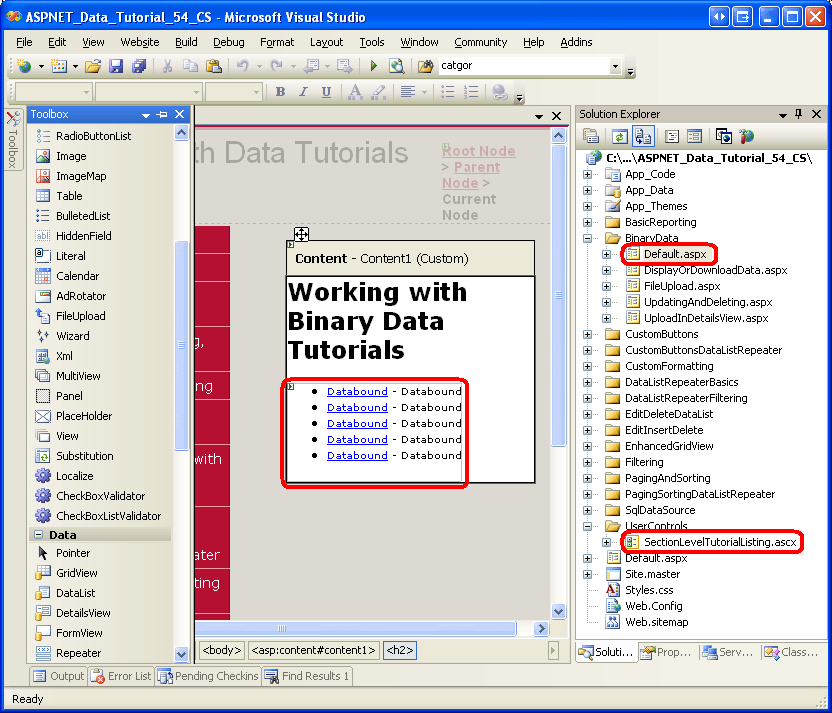 Como nas outras pastas, Default.aspx na BinaryData pasta listará os tutoriais em sua seção. Lembre-se de que o SectionLevelTutorialListing.ascx Controle de Usuário fornece essa funcionalidade. Portanto, adicione esse Controle de Usuário arrastando-o Default.aspx do Gerenciador de Soluções para o modo de exibição Design da página.