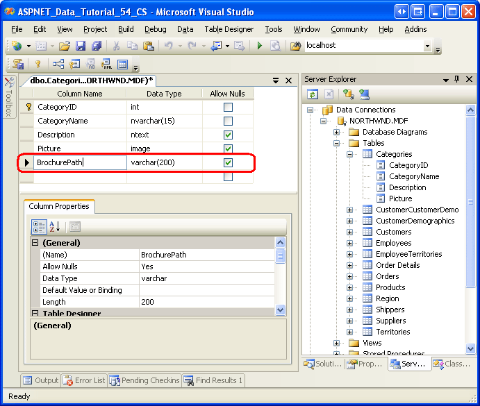 Para este tutorial e os próximos três, usaremos as duas abordagens. A Categories tabela já possui uma Picture coluna para armazenar o conteúdo binário de uma imagem para a categoria. Adicionaremos uma coluna adicional, BrochurePath, para armazenar um caminho para um PDF no sistema de arquivos do servidor Web que pode ser usado para fornecer uma visão geral polida e com qualidade de impressão da categoria.