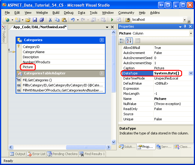 Comece adicionando essas duas colunas ao CategoriesDataTable. Clique com o botão direito do CategoriesDataTable mouse no cabeçalho s, selecione Adicionar no menu de contexto e escolha a opção Coluna. Isso criará um novo DataColumn na DataTable chamado Column1. Renomeie esta coluna para Picture. Na janela Propriedades, defina a DataColumn propriedade s DataType como System.Byte[] (essa não é uma opção na lista suspensa; você precisa digitá-la).