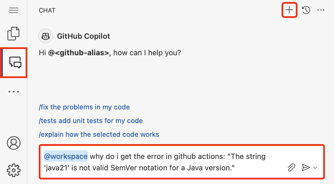 @workspace. Para obter mais informações, consulte Use the @workspace agent. - Na sessão de chat, o GitHub Copilot pode sugerir alterações e (com