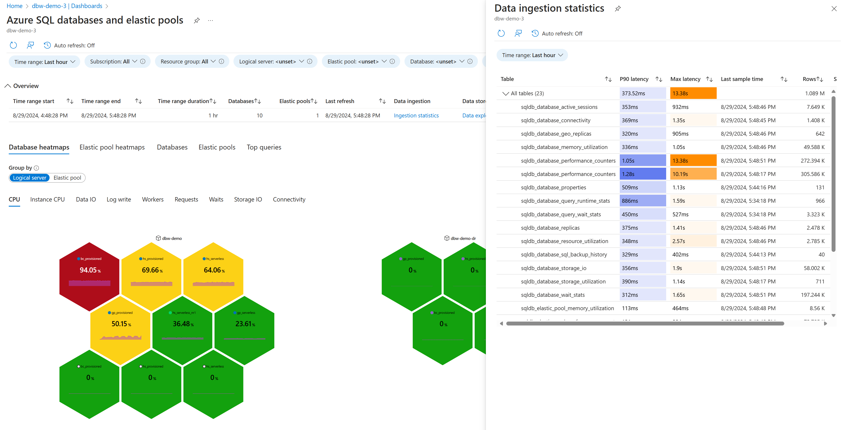 | Dashboards de recursos | Visualize dados de monitoramento detalhados para um banco de dados, um pool elástico ou uma instância gerenciada de SQL, incluindo: - Sessões ativas - Histórico de backup - Contadores de desempenho comuns - Probes de conectividade - Propriedades e configuração do banco de dados e da instância - Replicação geográfica - Metadados de índice, estatísticas de uso, avisos e sugestões - Uso do recurso - Estatísticas de sessão e de conexão - Estado e histórico do trabalho do SQL Agent - Consumo e desempenho de armazenamento – Metadados da tabela - Principais consultas - Estatísticas de espera Use listas suspensas de recursos para alternar rapidamente de um recurso para outro. Use o link patrimônio para reduzir um painel do patrimônio. |
