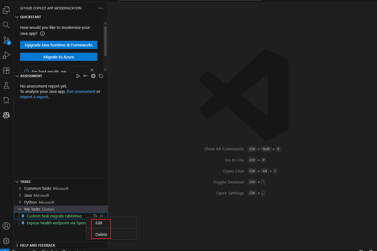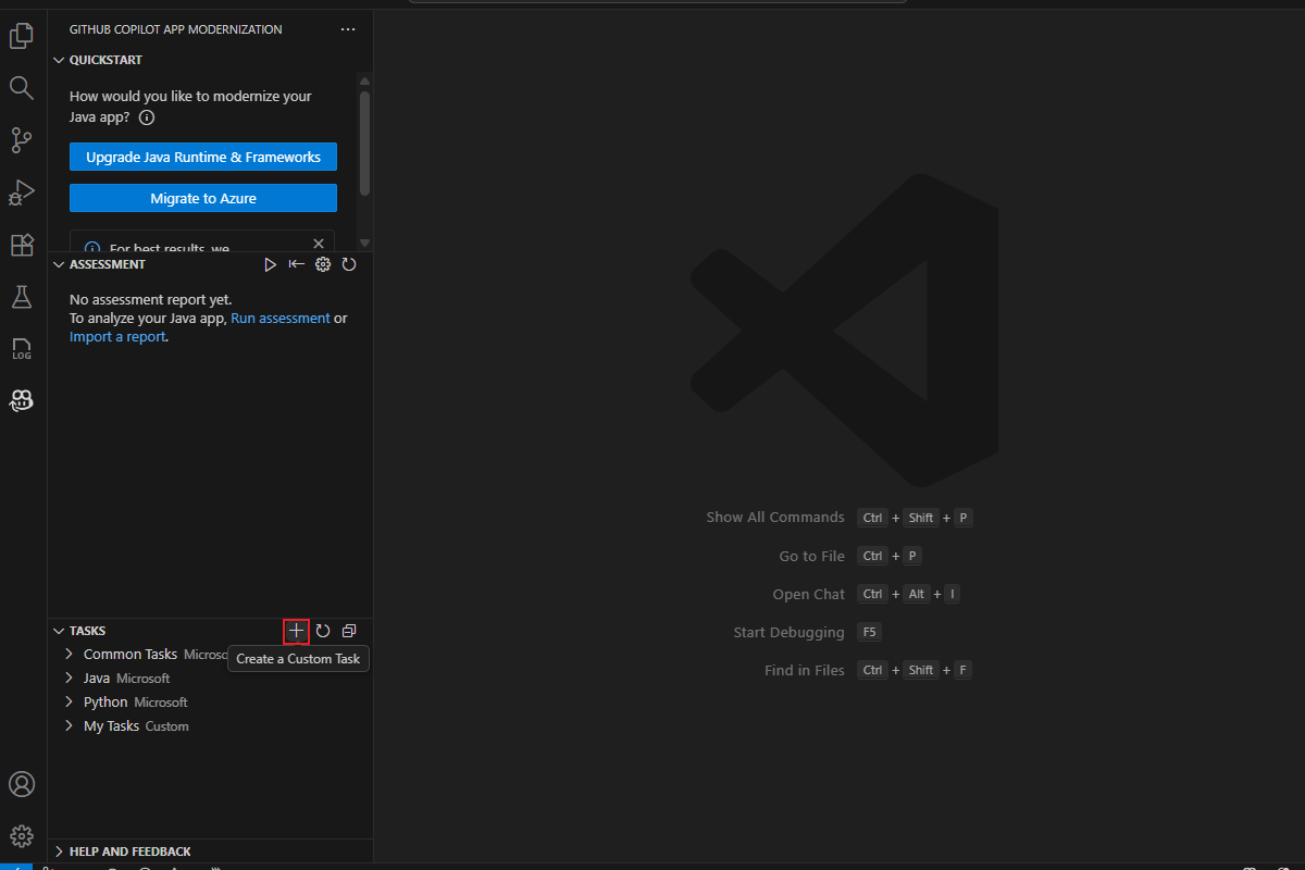 rabbitmq-senderpasta do projeto do repositório clonado. Em seguida, mude para o branch de origem.Na barra lateral atividade , abra o painel de extensão de modernização do aplicativo GitHub Copilot , passe o mouse sobre a seção TAREFAS e selecione Criar uma Tarefa Personalizada.