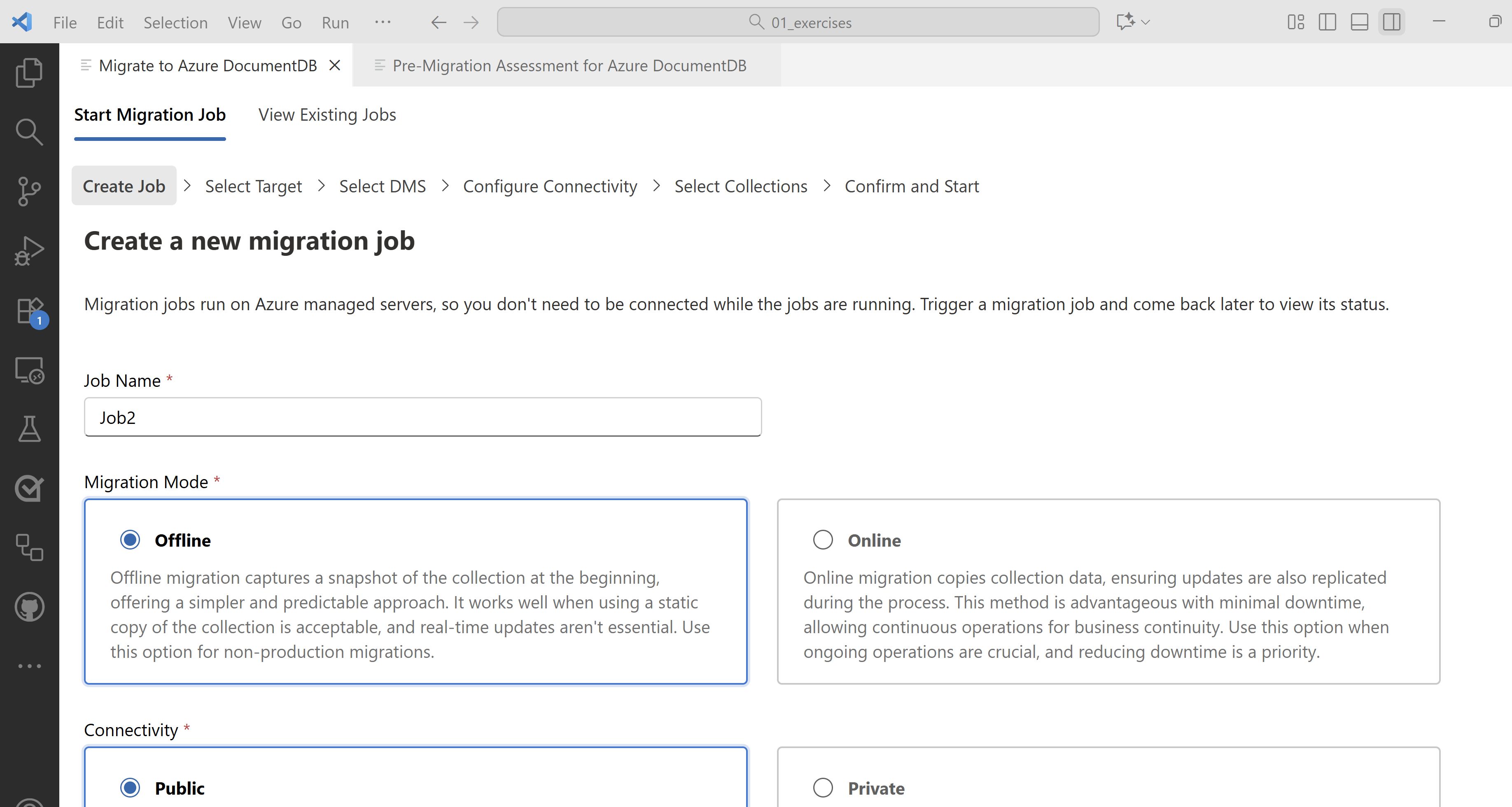 Neste tutorial, você usará a Extensão de Migração do Azure DocumentDB no Visual Studio Code para criar e gerenciar trabalhos de migração de uma instância local ou de nuvem do MongoDB para o Azure DocumentDB. Essa extensão fornece uma interface amigável para o desenvolvedor para executar migrações sem interrupções de serviço. A extensão elimina a necessidade de infraestrutura adicional e oferece conectividade segura, uso de custo zero e controle granular sobre quais bancos de dados e coleções migrar.