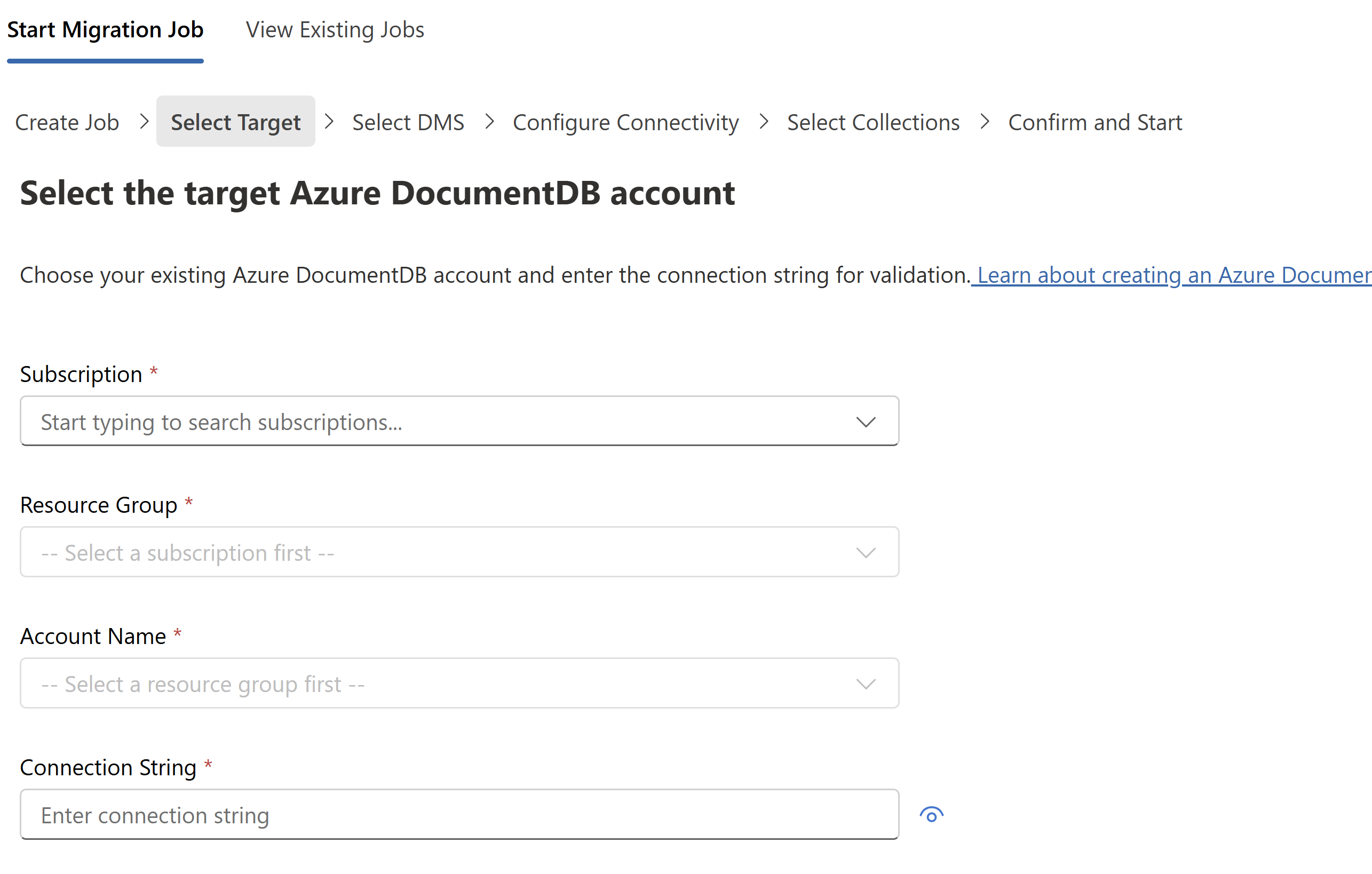 Nesta etapa, você seleciona uma conta existente do Azure DocumentDB e fornece sua cadeia de conexão.