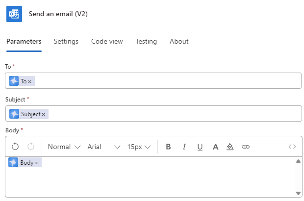 Você pode controlar com precisão quais entradas de ação vêm de fontes que não são de modelo e quais entradas vêm do modelo. Por exemplo, suponha que uma ferramenta tenha uma ação que envie emails. Você pode fornecer um corpo de email simples e principalmente estático, mas usar saídas geradas por modelo para parte desse corpo de email.