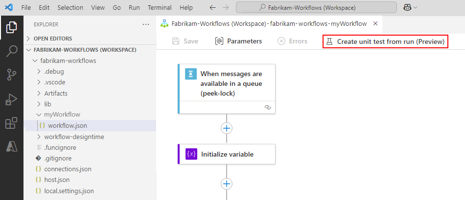 Este guia mostra como criar uma definição de teste de unidade de um fluxo de trabalho. Essa definição simula as chamadas externas de cada operação de fluxo de trabalho sem alterar a lógica do fluxo de trabalho. Ao criar um teste de unidade para um fluxo de trabalho, você obtém um projeto de teste de unidade que inclui as seguintes pastas:
