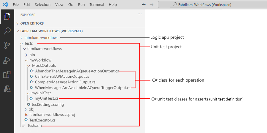 Uma pasta para cada definição de teste de unidade. Essa pasta inclui um arquivo C# que contém uma classe de exemplo e métodos. Use essa classe e métodos para configurar suas próprias declarações, confirme se o fluxo de trabalho se comporta conforme o esperado e verifique se o fluxo de trabalho se comporta de forma confiável e previsível em seu ecossistema maior do Azure.