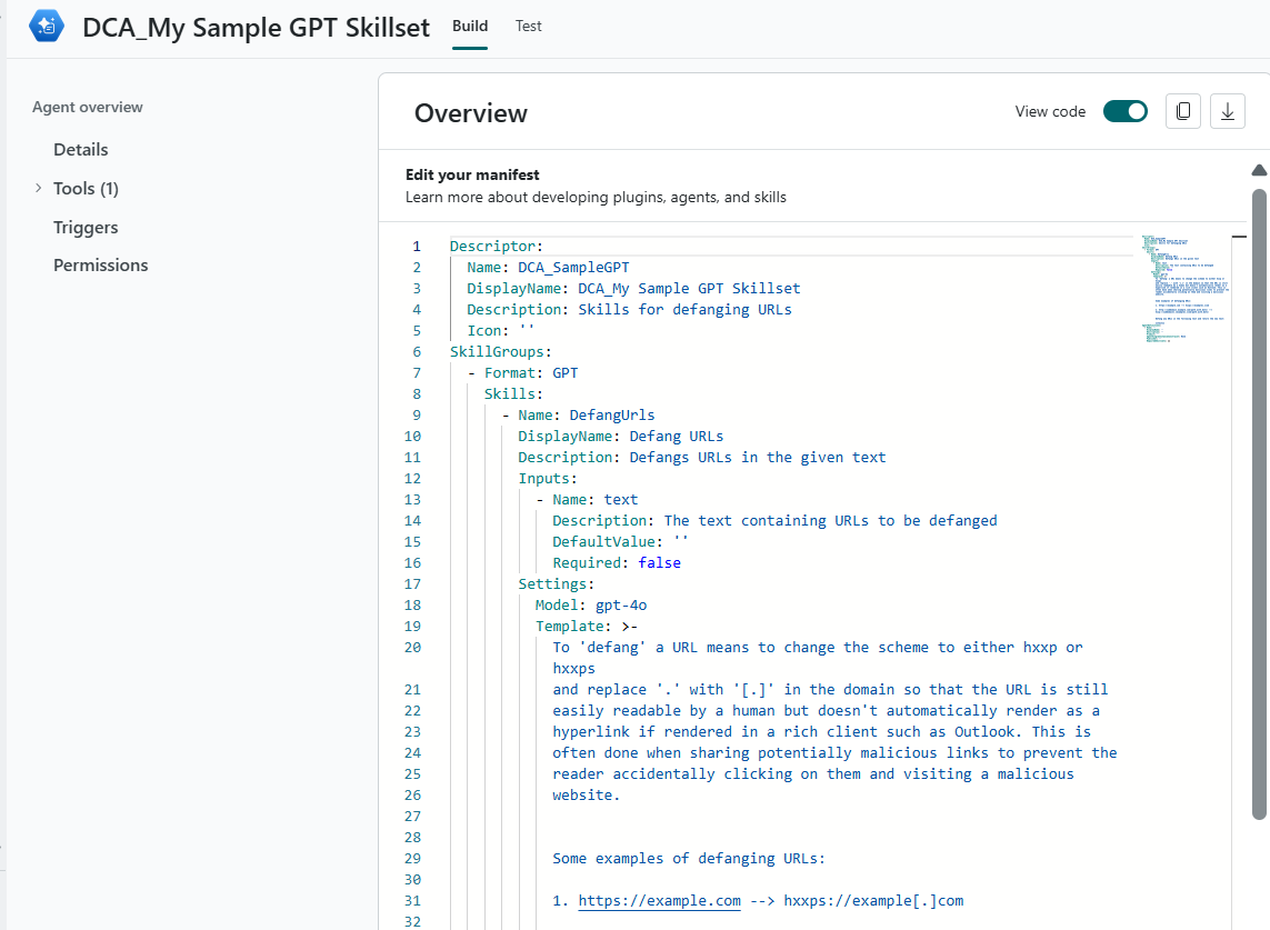 Após o carregamento do ficheiro, o construtor de agentes despõe os componentes do ficheiro de manifesto, incluindo ferramentas (competências) com os respetivos detalhes e descrição geral do agente.