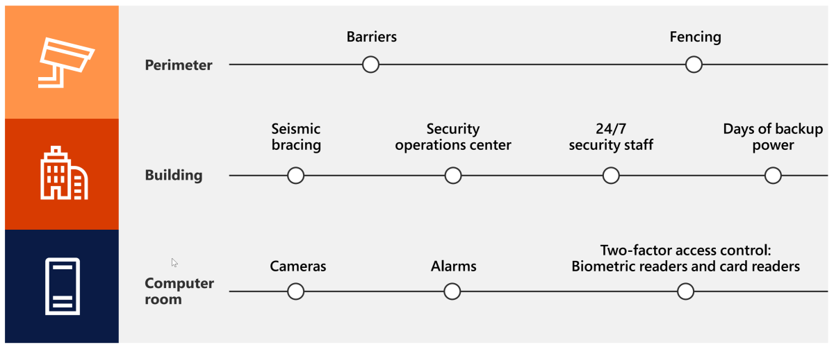 Microsoft designs, builds, and operates datacenters that strictly control physical access to the areas where your data is stored. We understand the importance of protecting your data and we're committed to securing the datacenters that host it. We have a dedicated team at Microsoft that focuses on designing, building, and operating the physical facilities that support Azure. As shown in the following illustration, this team invests in state-of-the-art physical security features like these: