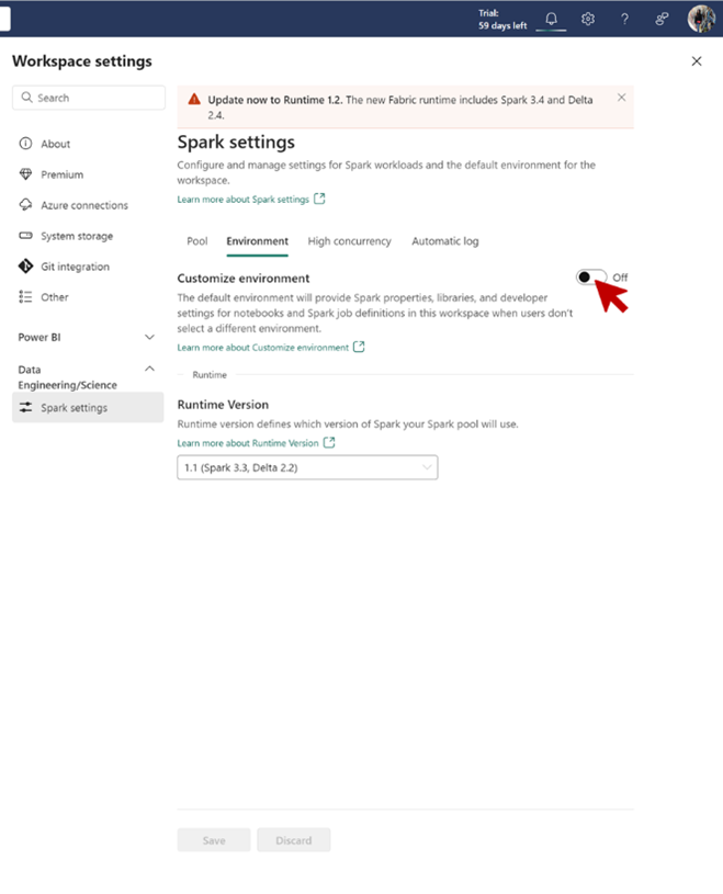As configurações de workspace de Engenharia de Dados e Ciência de Dados são atualizadas para incluir ambientes do Fabric. Como parte dessa atualização, o Fabric não dá mais suporte à adição de novas bibliotecas e propriedades do Spark nas configurações do workspace. Em vez disso, você pode criar um ambiente do Fabric, configurar a biblioteca e a propriedade nele e anexá-lo como o ambiente padrão do workspace. Depois de criar um ambiente e defini-lo como o padrão, você pode migrar as bibliotecas existentes e as propriedades do Spark para esse ambiente padrão.