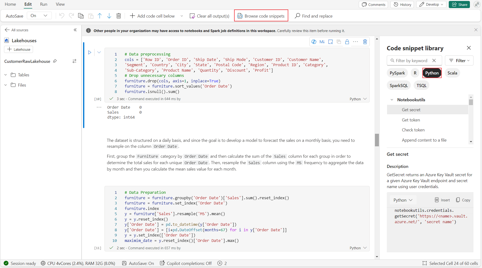 Lakehouse e recursos estão nativamente disponíveis: o Fabric Lakehouse, juntamente com a funcionalidade completa dos Recursos integrados ao Notebook, está disponível no notebook Python. Esse recurso permite que os usuários levem facilmente os dados para o Python Notebook. Basta tentar arrastar e soltar para obter o trecho de código.