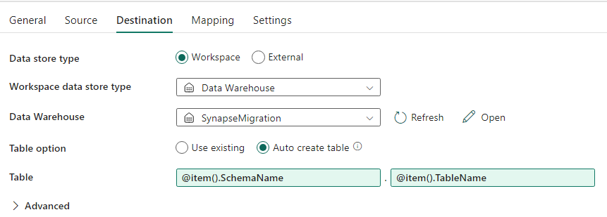 - Essa opção exige que os usuários criem o esquema (DDL) no Fabric Warehouse antes de ingerir os dados. Considere as opções neste artigo para migrar o esquema (DDL).