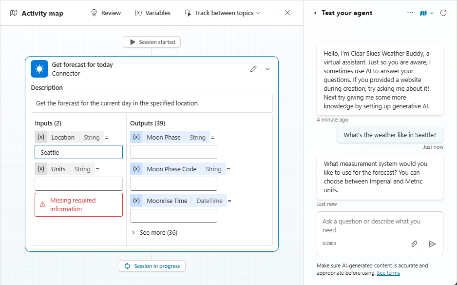 Neste exemplo, o usuário pergunta: "Como está o clima em Seattle?". O agente seleciona a ferramenta de clima atual e também pré-popula a entrada Local com "Seattle", que ele reconheceu da pergunta do usuário.